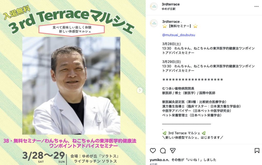 2026.03.25院長がゆめが丘ソラトスのトークイベントに登壇します 「わんちゃん、ねこちゃんの東洋医学的健康法」について、3月28日・29日の13時30分より、ゆめが丘ソラトスのトークイベントにてお話しいたします。ご興味のある方はお気軽にご参加ください。